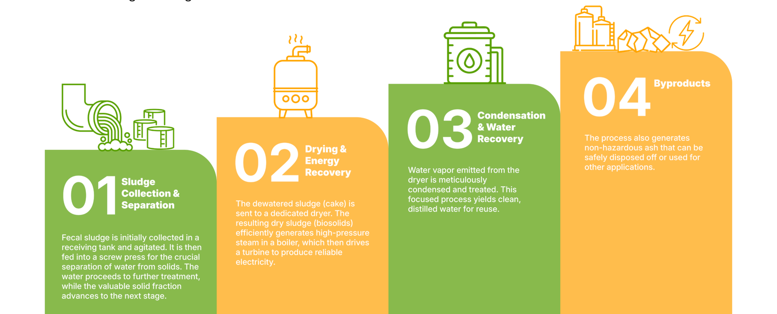 The Omni Processor reduces sludge volume, recovers energy and water, and provides a sustainable solution for fecal sludge treatment.